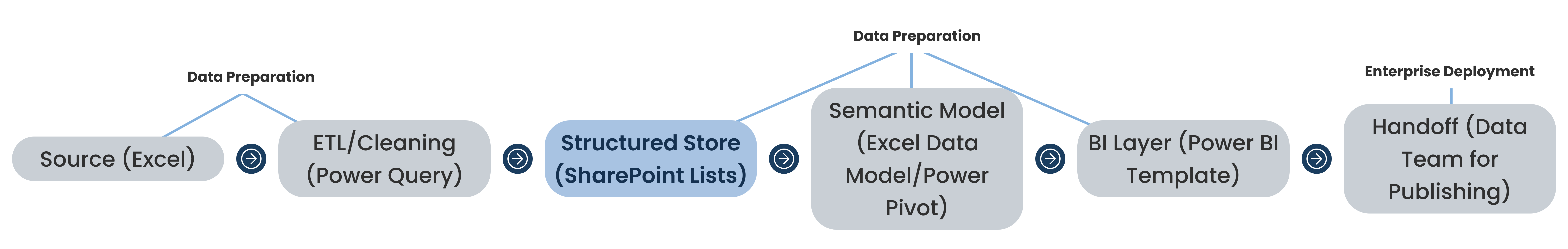 Fig 2.0: Data Architecture Overview. An end-to-end pipeline integrating Excel-based ETL with SharePoint List storage and Power BI for enterprise-grade reporting.